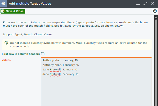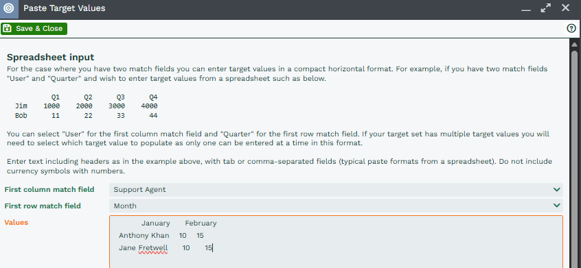 This option allows you to copy and paste data that is stored in a spreadsheet program such as Microsoft Excel into the below text field, which Workbooks will then use to automatically populate the Target values on the previous view. The screenshot below shows the outcome of copying in a series of data from Excel, which can then be saved and stored in Workbooks as Target values. Column Header: Month, Row Header: Support Agent Name