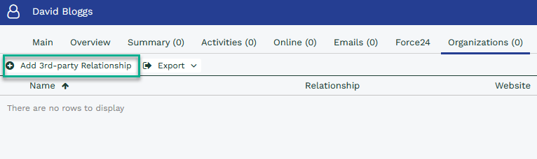 Open a Person record, and then select the Organisation tab along the top of a record. From here, you will see a button called “Add 3rd Party Relationship”: