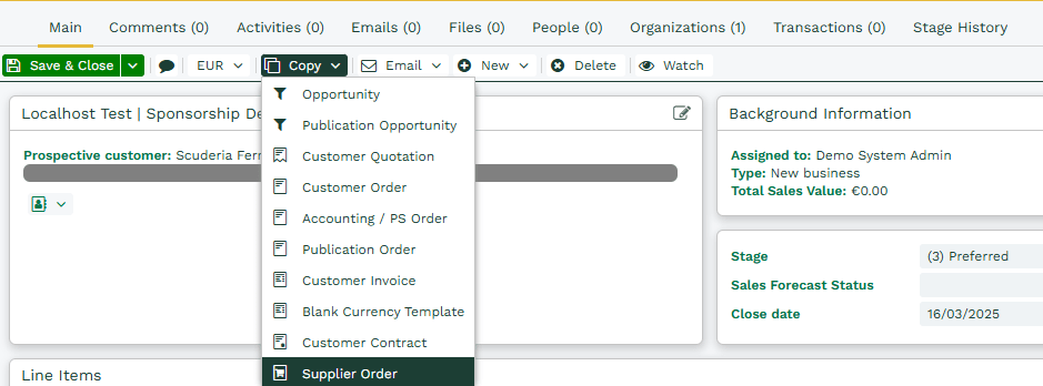To simplify the creation of Transaction Documents such as Quotations, Orders, Invoices and Contracts it is now possible to create a copy of any existing record to create another. When creating a copy you can choose whether to make a fresh copy of the same type of record or use the data to create a different record type, such as copying an Opportunity to a Customer Quotation or a Customer Order to a Customer Contract. This can be accessed by using the Copy button found at the top of all Transaction Documents.