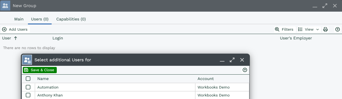 To add a User to a group, open the Users tab click Add Users and tick the checkbox next to the appropriate User.