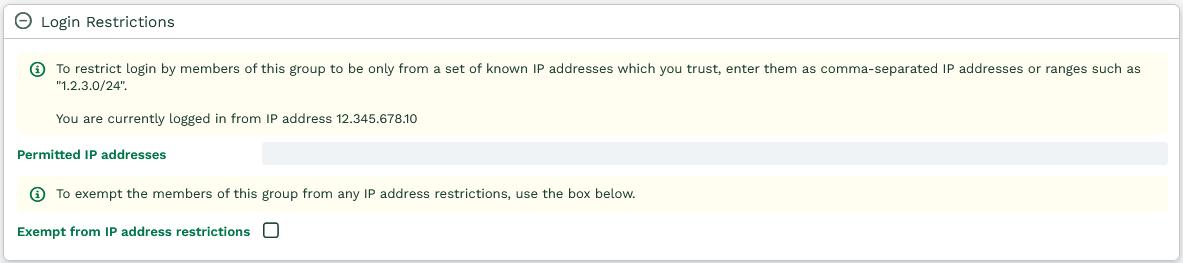 If you want to limit the location from which members of this group can login to Workbooks you should open the Login Restrictions reveal. In the Permitted IP addresses field, you should enter the IP address or addresses from which the group members are allowed to log in.