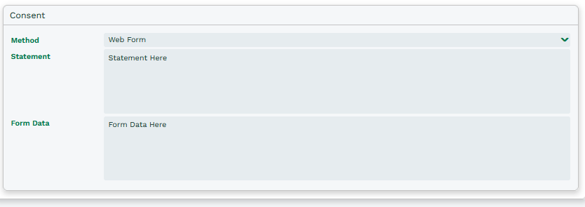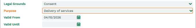 If you select Consent as the Legal Grounds for processing the data, you will also see three additional fields: