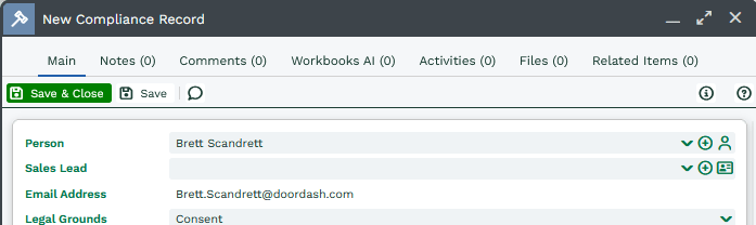 When creating a new Compliance Record, the Person or LeadĀ field will automatically be populated, along with their Email address from the Person or Lead record.