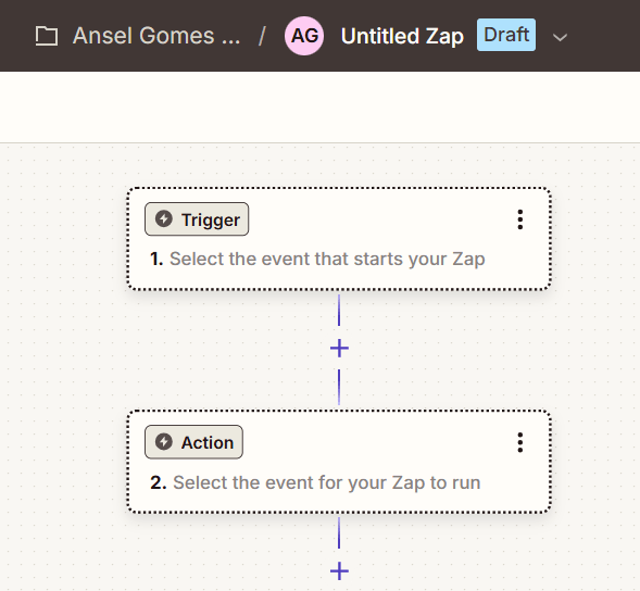 When you first create a Zap, you will see the below. There is a ‘plus’ button in between the Trigger and Action step, or there is a larger ‘plus’ button after the Action step.