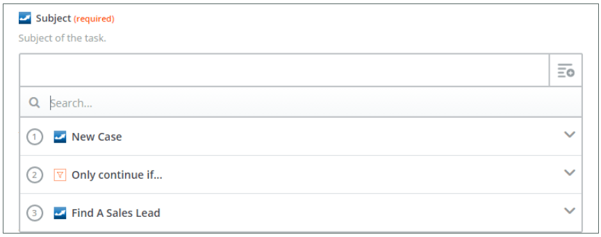 In any steps that come after this Search step, you will now be able to map data either received from the Trigger or from the Search step. Simply click on the dropdown arrow next to the relevant step to pick the required field.